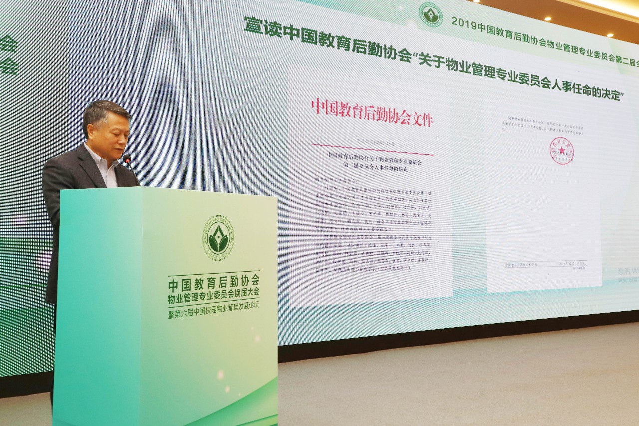 牛维麟常务副会长宣读《中国教育后勤协会关于物业管理专业委员会第二届委员会人事任命的决定》。