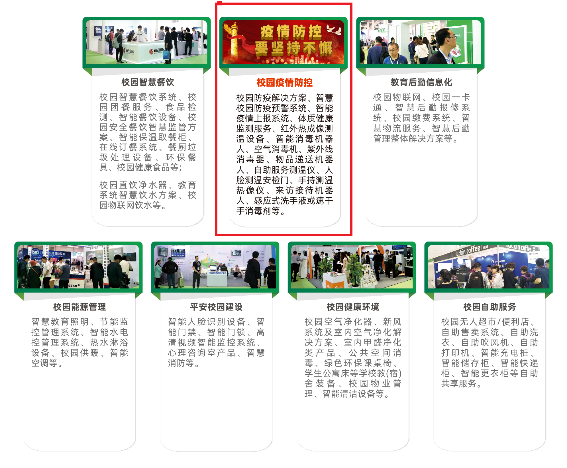 随着市场需求的增加,越来越多的后勤设施设备加入到后勤版块,2020中国广东会览会展示内容全新升级:校园智慧餐饮、校园能源管理、校园后勤信息化、平安校园建设、校园健康环境、校园自助服务六大板块全方位涵盖教育后勤内容,根据疫情期间教育后勤在疫情防控的积极作为,2020中国广东会览会在六大板块基础上新增:校园疫情防控的展出内容。2020中国教育后勤览会全新升级再出发!