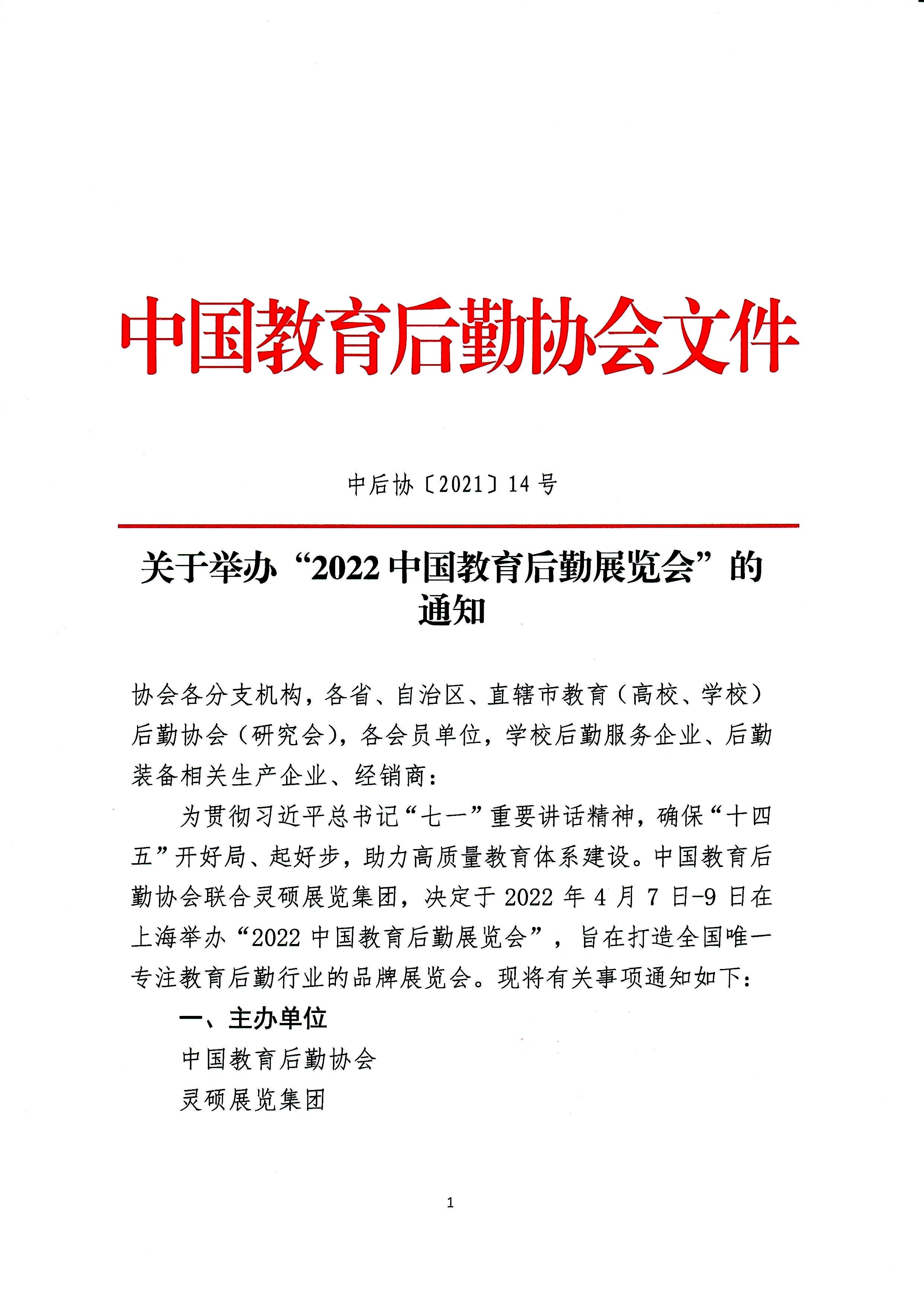 协会各分支机构,各省、自治区、直辖市教育(高校、学校)后勤协会(研究会),各会员单位,学校后勤服务企业、后勤装备相关生产企业、经销商:为贯彻习近平总书记“七一”重要讲话精神,确保“十四五”开好局、起好步,助力高质量教育体系建设。中国教育后勤协会联合灵硕展览集团,决定于2022年4月7日-9日在上海举办“2022中国广东会览会”,旨在打造全国唯一专注教育后勤行业的品牌展览会。现将有关事项通知如下: