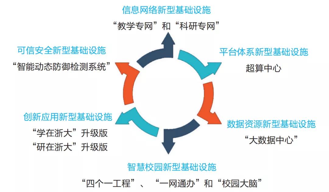 依托浙江大学信息化建设现有基础,结合《浙江大学“十四五”信息化建设规划》针对《新基建指导意见》,将在信息网络、平台体系、数字资源、智慧校园、创新应用、可信安全,六大核心方向进行建设布局。