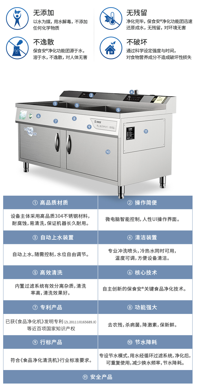 保食安?关键食品净化技术再现大自然中的水自我净化的原理,无任何化学添加,仅用自来水作为原材料,通过创新研发的保食安?关键食品净化技术发生器,使水分子裂解,生成具有极强氧化能力的保食安?净化功能团,从而快速杀灭食材上病毒、细菌等致病微生物,高效降解农残、激素、抗生素等化学残留,不产生二次污染,不破坏食物营养,对人与环境安全无害。