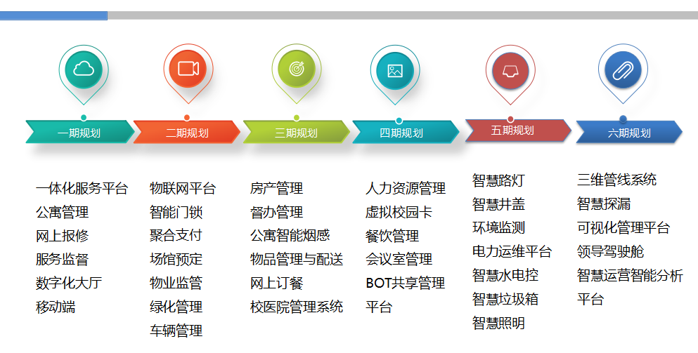 业务系统:公寓,报修,餐饮,绿化,房产,物业,车辆,校园生活,门锁,商业街,项目档案,网上调查,服务监督,能耗等。