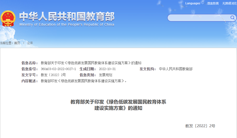 ▲教育部《绿色低碳发展国民教育体系建设实施方案》