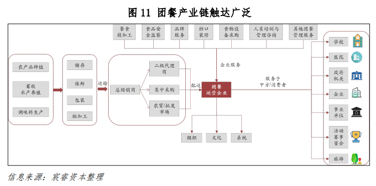 团餐产业链触达面较广,能够同时拉动一二三产业,是拉动乡村振兴、社区食堂、供销社建设等的重要环节。其上游覆盖农林牧渔等农业生产环节,中游包括屠宰加工、物流运输、设备系统等多个细分领域,下游链接园区、社区、学校等各类型的团餐服务场景。