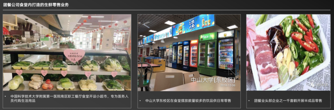 与此同时,千喜鹤、麦金地等团餐公司利用自己供应链优势和资源,在食堂内打造食品生鲜零售商,一些团餐企业也尝试通过食堂渠道将自身预制菜延伸到该场景中售卖,将预制菜销售渠道从ToB拓展到ToC,将食堂资源优势有效利用起来。