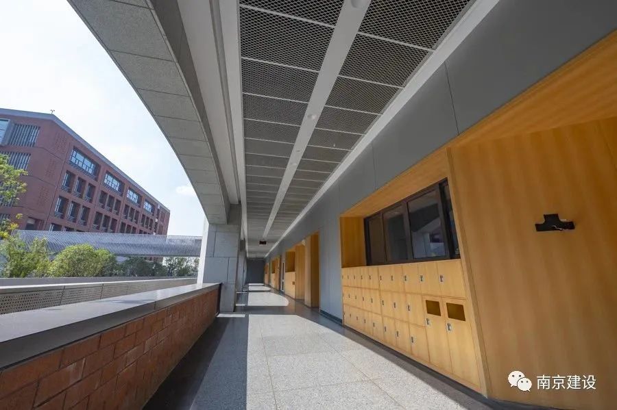 作为南外校园的特色,砖红色的外立面很是引人眼球。而打造这种墙面的红色陶土砖则具有隔音、透气、透水的性能,形成可呼吸式“表皮”(陶土砖幕墙)系统,同时还可以折射90%以上的光,保护学生视力。