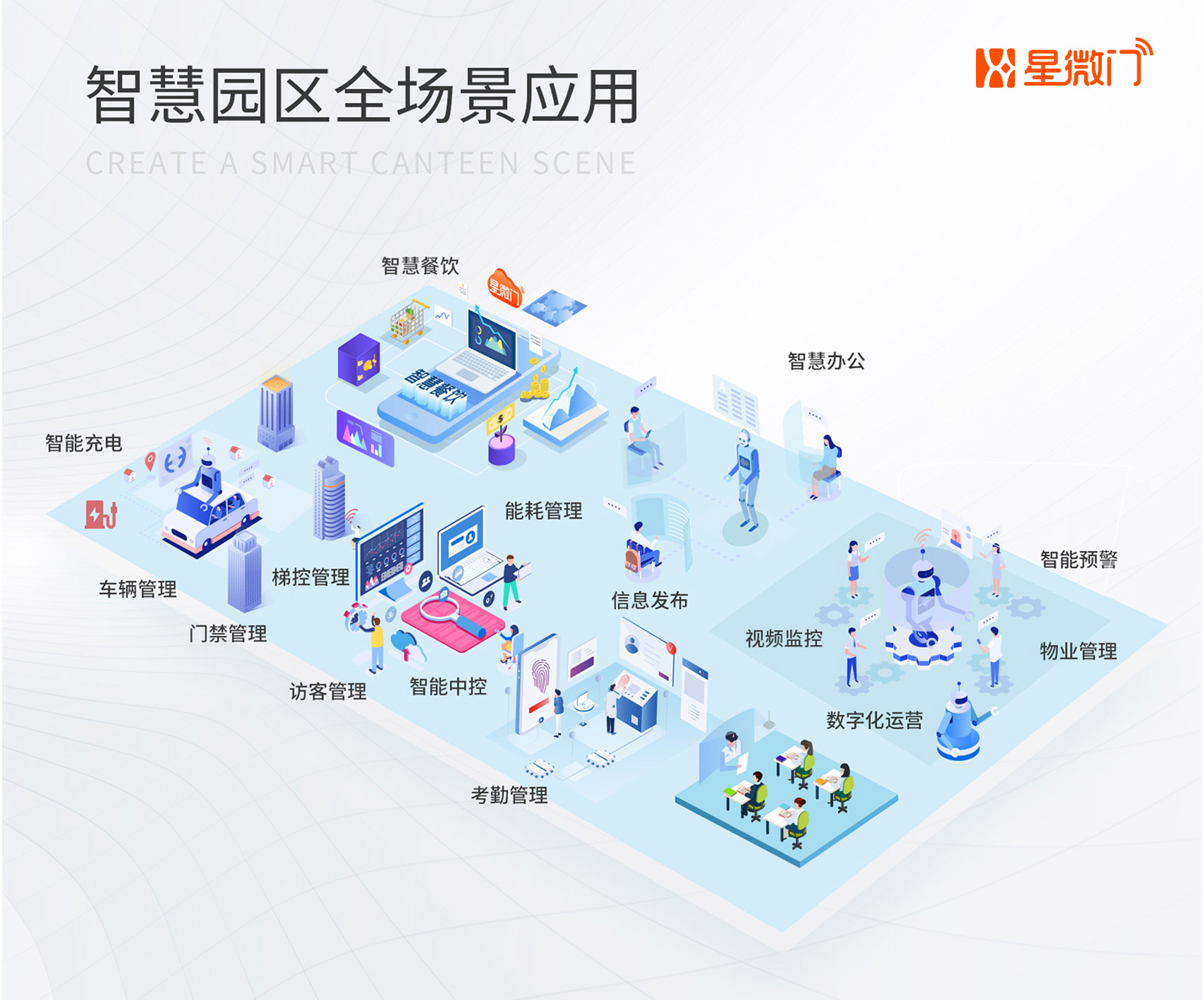 星微门智慧园区综合管理平台,提供人员车辆出入管理、智能充电、智能中控、智慧办公、智慧食堂、物业管理、能耗管理、信息发布、视频监控、智能预警、数字化运营等场景应用。