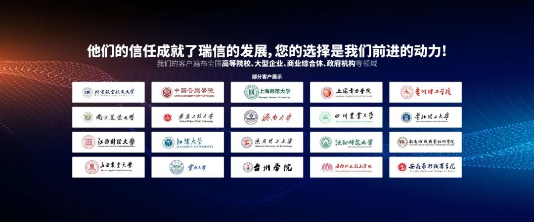 其中典型客户有中国音乐学院、北京航空航天大学、上海政法大学、上海理工大学、南京农业大学、苏州信息学院、安徽工程大学、淮南师范学院、河南新乡学院、湖北工业大学、江西农业大学、四川农业大学、山西农业大学、华北理工大学、广西师范大学、贵州理工学院等重量级高校。