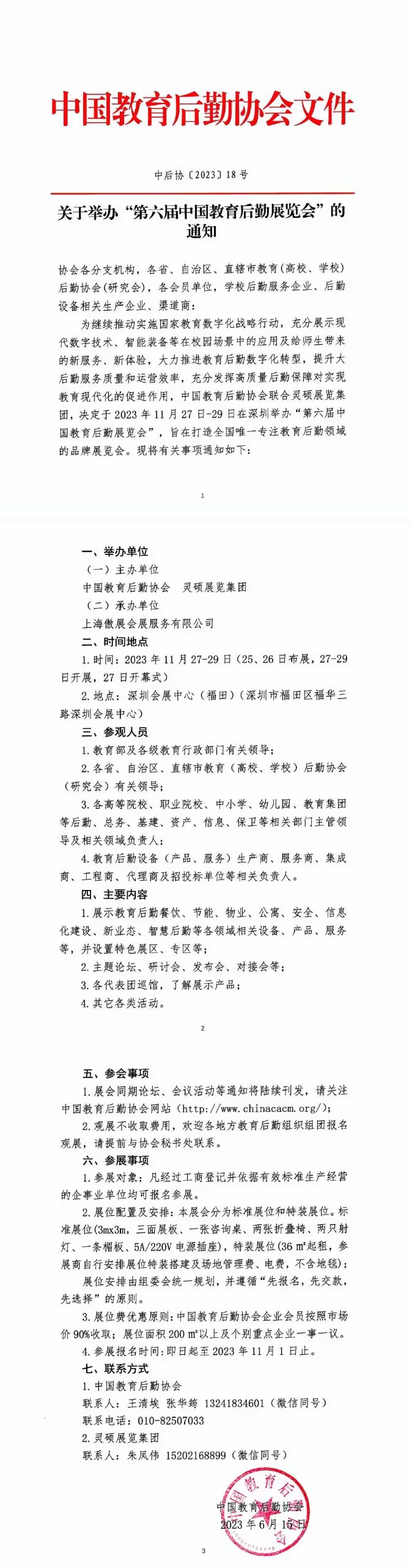 为继续推动实施国家教育数字化战略行动,充分展示现代数字技术、智能装备等在校园场景中的应用及给师生带来的新服务、新体验,大力推进教育后勤数字化转型,提升大后勤服务质量和运营效率,充分发挥高质量后勤保障对实现教育现代化的促进作用,中国教育后勤协会联合灵硕展览集团,决定于2023年11月27日-29 日在深圳举办“第六届中国广东会览会”,旨在打造全国唯一专注教育后勤领域的品牌展览会。
