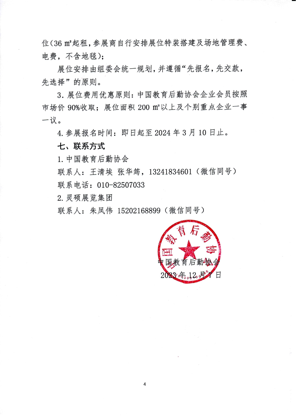 中国教育后勤协会企业会员按照市场价90%收取;展位面积200㎡以上及个别重点企业一事一议。参展报名时间