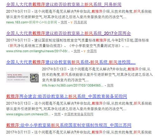 全国人大代表戴雅萍曾在两会建议给幼儿园和中小学教室安装新风系统。她说,学生到校后90%的时间都待在教室里,如果教室空气受到污染,孩子们无疑就成了“受害者”。她介绍到,中小学幼儿园教室安装新风系统有绝对的必要性,也有很高的可行性。2017年2月1日起,团体标准《新风净化系统施工质量验收规范》、《中小学教室空气质量测试方法》、《中小学教室空气质量规范》正式实施。但这三项标准均由中国教育装备协会提出,都不是国家政府层面上的规范和标准,执行也非强制。她建议,制定国家层面的强制技术标准,由财政拨款给中小学校教室统一安装新风系统,保护祖国的未来。“还可以研发适合中小学专用的空气质量净化系统和监测系统,让校方和家长可以通过电视屏幕或手机随时观察了解孩子所在教室的空气质量状况。”戴雅萍说。