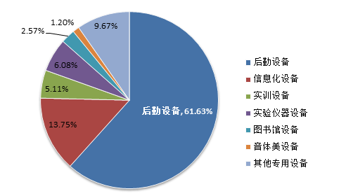 7月份教育装备行业招标采购信息分类占比情况如上图所示:后勤设备招标采购信息共计3403条,占61.63%;信息化设备招标采购信息共计759条,占13.75%;实验仪器设备招标采购信息共计336条,占6.08%;实训设备招标采购信息共计282条,占5.11%;图书馆设备招标采购信息共计142条,占2.57%;音体美设备招标采购信息共计66条,占1.20%;其他专用设备招标采购信息共计534条,占9.67%。