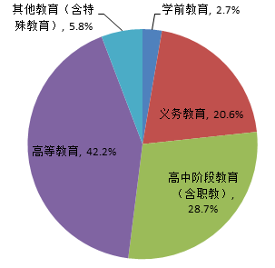 7月份招标采购信息所属领域统计情况如图6所示:学前教育占比为2.7%;义务教育占比为20.6%;高中阶段教育(含职教)占比为28.7%;高等教育占比为42.2%;其他教育(含特殊教育)占比为5.8%。