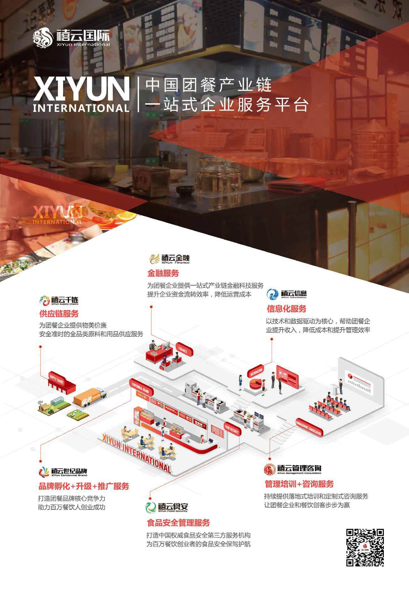 禧云国际致力于打造中国团餐产业链一站式企业服务平台。作为团餐产业标准化服务的先行者,公司创始人及一些核心团队成员深耕团餐产业20 年,同时又吸纳许多优秀的互联网公司精英联合创业,希望通过专业的团餐企业服务运营经验、丰富的市场行业资源及互联网技术创新能力,为广大团餐企业提供供应链集中采购、品牌整合营销、食品安全管理、人才管理培训、企业信息化建设、金融科技服务等一站式综合服务,帮助企业打造自身“品牌化、集约化、安全化、职业化、信息化、数据化”的核心竞争力,推动产业上下游共同发展与转型,助力我国团餐市场发展迈入一个新的台阶。