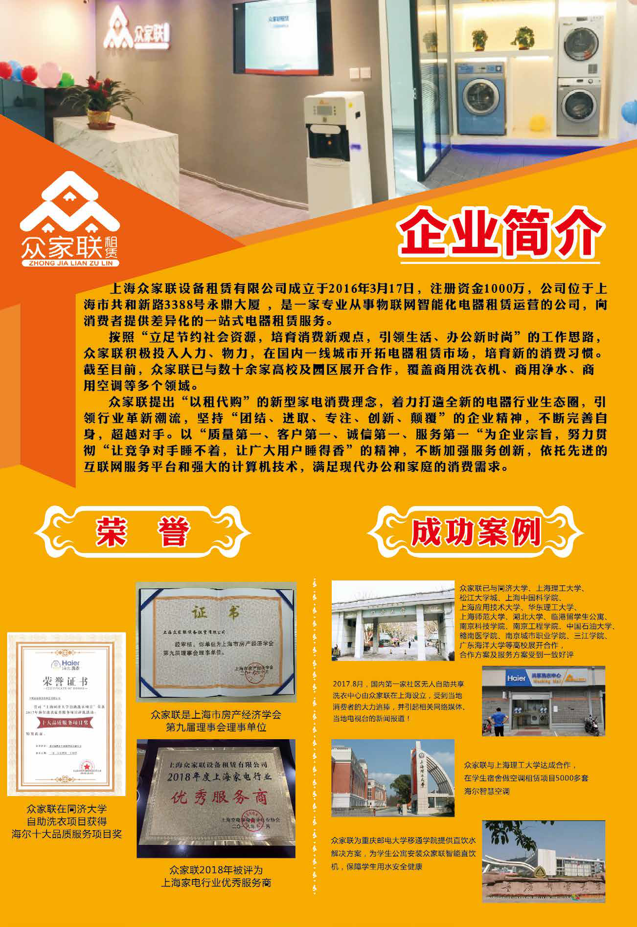 上海众家联家电租赁有限公司成立于 2016 年 3 月17 日,注册资金 1000 万,是一家专业从事物联网智能化电器租赁运营的公司,专为广大用户提供电器租赁解决方案 ,向消费者提供差异化的一站式电器租赁服务。