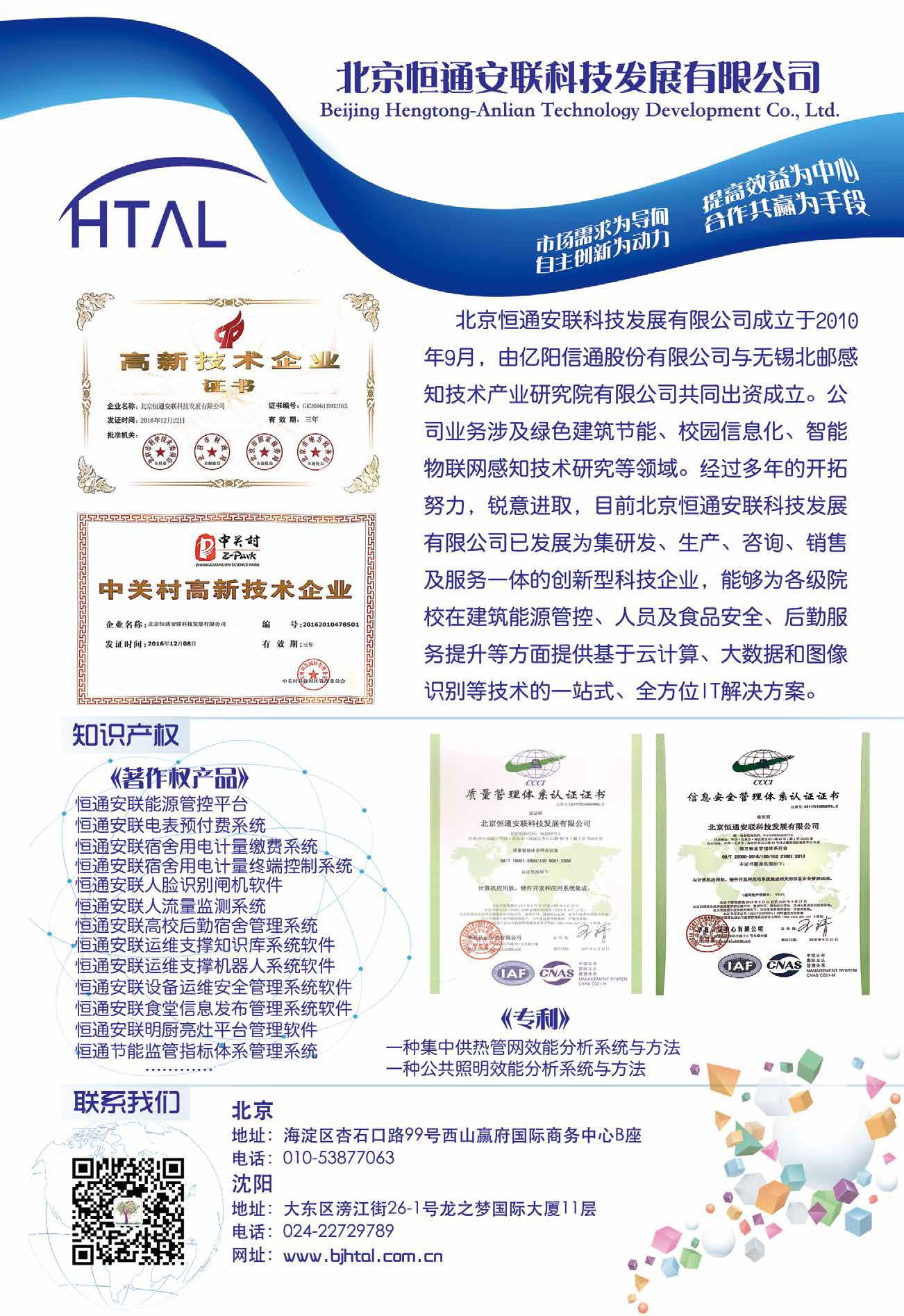 北京恒通安联科技发展有限公司成立于2010年9月,由亿阳信通股份有限公司与无锡北邮感知技术产业研究院有限公司共同出资成立。公司业务涉及绿色建筑节能、校园信息化、智能物联网感知技术研究等领域。经过多年的开拓努力,锐意进取,目前北京恒通安联科技发展有限公司已发展为集研发、生产、咨询、销售及服务一体的创新型科技企业,能够为各级院校在建筑能源管控、人员及食品安全、后勤服务提升等方面提供基于云计算、大数据和图像识别等技术的一站式、全方位IT 解决方案。